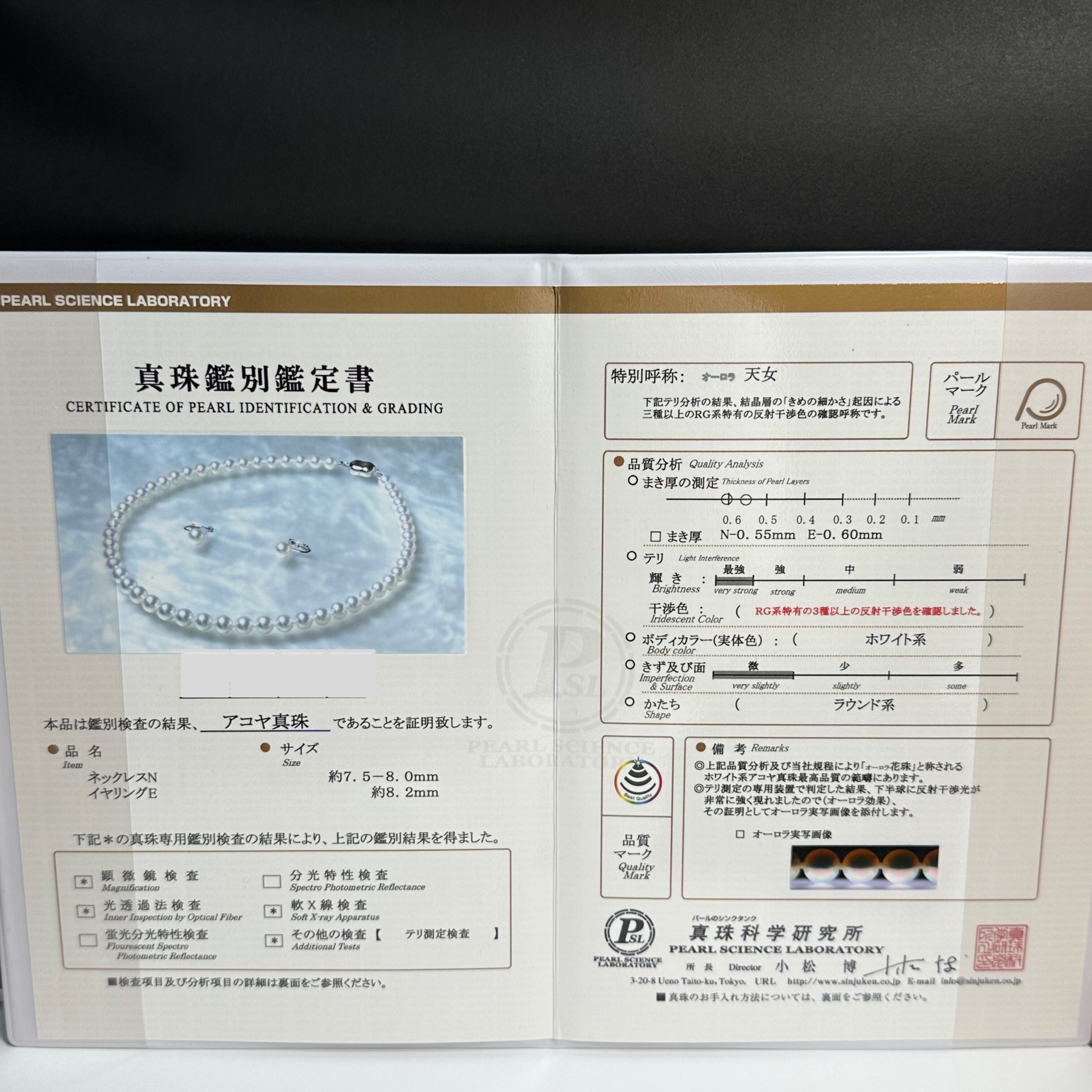 オーロラ天女 あこや アコヤ真珠 7.5〜8mm K14WG 真珠科学研究所